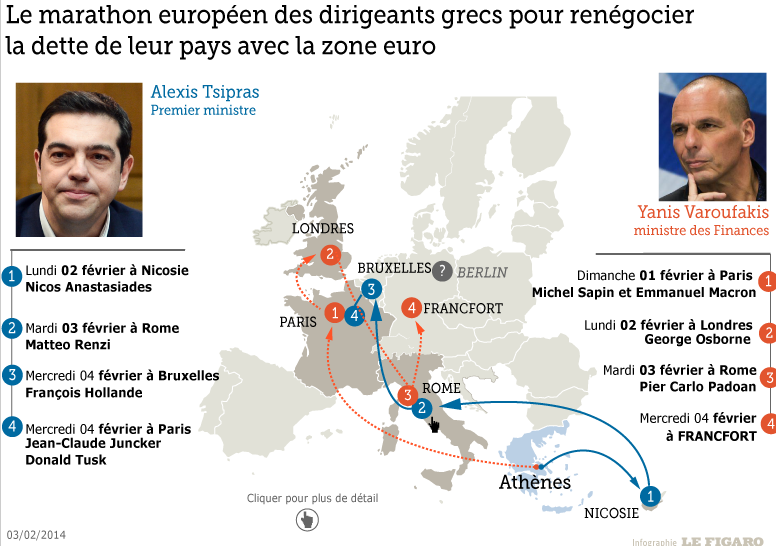Αναγκάστηκε να κάνει χάρτη με τα πήγαινε-έλα του Ελληνα Πρωθυπουργού Αλέξη Τσίπρα και του υπουργού Οικονομικών Γιάνη Βαρουφάκη η εφημερίδα Le Figaro. Περιγράφει μια «νέα γενιά σαραντάρηδων» που αγωνίζεται για την επιστροφή στην ανάπτυξη.